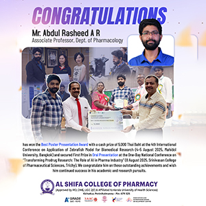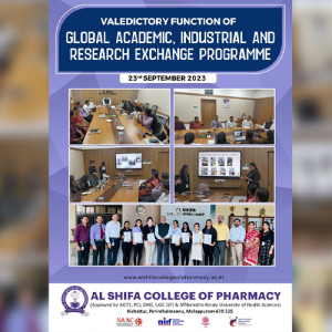 Al Shifa College of Pharmacy remains dedicated to creating opportunities for its faculty and students to engage with premier global institutions and to position itself as a leading centre for innovative research and translational science.