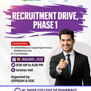 Al Shifa College of Pharmacy hosted recruitment event on January 16, 2026, from 9:00 AM to 4:00 PM in the Seminar Hall. The drive is a collaborative effort organized by UDYOGAH & IQAC to provide employment opportunities for pharmacy students and professionals. It features prominent recruiters from the pharmaceutical and healthcare sectors.