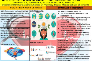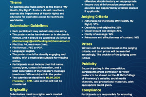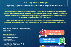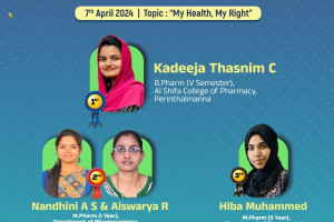 On the occasion of World Health Day 2024, the Department of Pharmacology at Al Shifa College of Pharmacy, Kerala, organized a national e-poster competition centered around the theme “My Health, My Right” on April 7th, 2024. The competition aimed to raise awareness about the significance of individual health rights and promote creative expression in advocating for healthcare equity. The competition received an overwhelming response with more than 50 participants from various regions across India. Each participant contributed their unique perspectives and insights on the theme, showcasing a diverse range of artistic and informative e-posters. |