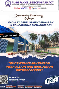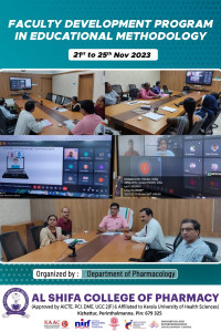 A 5-day Faculty Development Programme was conducted by the Department of Pharmacology, Al Shifa College of Pharmacy on 21/11/2023 to 25/11/2023 at 9.30 am to 12.15 pm. The programmes included the Educational Methodology on the topic EMPOWERING EDUCATORS: INSTRUCTION AND EVALUATION METHODOLOGIES”. Dr.A.R.Mahesh, Assistant Professor, Faculty of Pharmacy, M. S Ramaiah University of Applied Sciences, Bengaluru, on the topic “Eduaction as a system and Learning theories and Psychology of Education”. Next session was handled by Dr.Umasankar Subramanian, Managing Director, Med Bot & Adjunct Faculty, Dayananda Sagar University. He has taken the session on the topic, “Teaching-learning methods, Teaching learning media and Educational Communication”. by Dr.Sangeetha R, Associate Professor, Department of Oral Pathology, Dayananda Sagar College of Dental Sciences, Bengaluru. She has covered the topic, “Principles of students assessment, Blueprinting for question paper and writing questions as essay, short answers and short open”. On the 4th day the topic, “Theoretical basis for skill assessment in Practical / Clinical competencies, Technology based assessment models and objectives of structured viva” has been taken by Dr. Nagashree S.R, Associate Professor, Vokkaligara Sangha Dental college and Hospital, Bengaluru. |