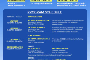 The first topic was covered by Dr. A. Thanga Thirupathi, who spoke on “Overview of OECD Guidelines for the Testing of Chemicals.” The second session was conducted by Dr. S. Vimal Kumar, Professor and Head of the Department of Pharmacology, on the topic “Common Laboratory Techniques and Ethical Standards in Animal Research: A Review of CCSEA Guidelines and Best Practices.” The afternoon session was led by Mr. A.R.Abdul Rasheed, Associate Professor in the Department of Pharmacology, on the topic “Introduction to Experimental Animal Models: Ethical Considerations and Routes of Administration.” The first demonstration was given by Mr. Suhail P.T., Associate Professor in the Department of Pharmacology, on “Commonly Used Instruments in Experimental Pharmacology.” The second demonstration was handled by Dr. A. Thanga Thirupathi. |