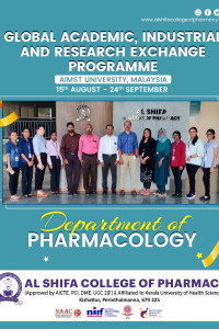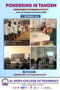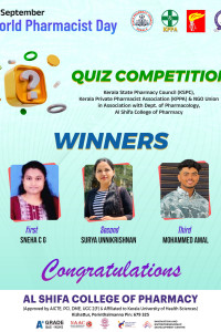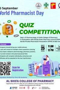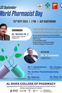 The World Pharmacist Day was celebrated with great enthusiasm at Al Shifa College of Pharmacy, organized by the Department of Pharmacology in collaboration with the Kerala State Pharmacy Council (KSPC), Kerala Private Pharmacist Association (KPPA), and NGO Union on 25th September 2024.The event took place in presence of Dr. Nishith M. C., District Drug Inspector, and members of KPPA and NGO. |