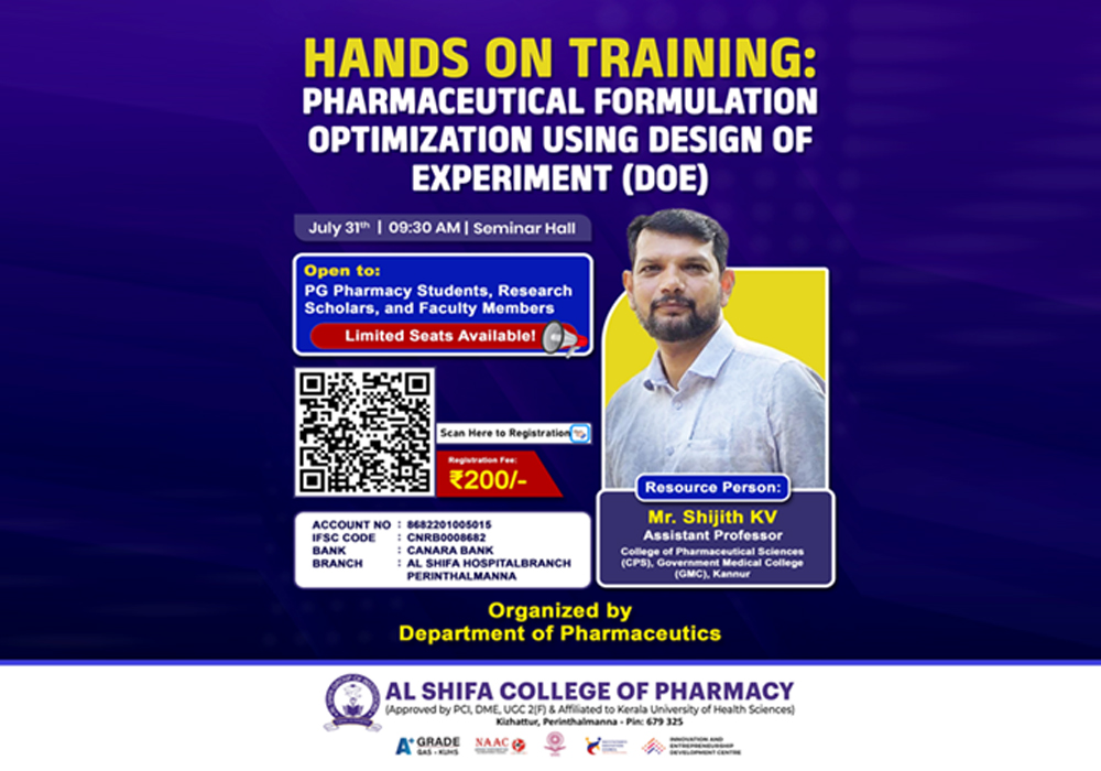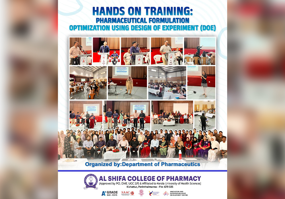 The Department of Pharmaceutics, Al Shifa College of Pharmacy, organized a one-day hands-on training program titled “Pharmaceutical Formulation Optimization Using Design of Experiment (DOE)”on 31st July 2025. The program was designed to provide practical insights into the application of DOE in pharmaceutical formulation development