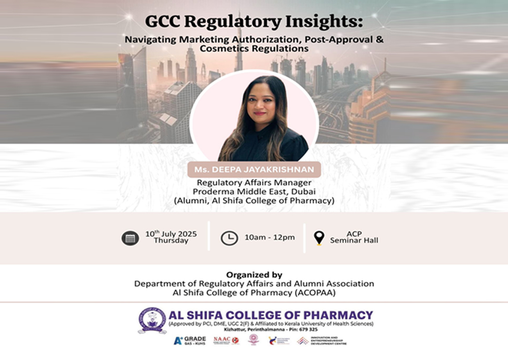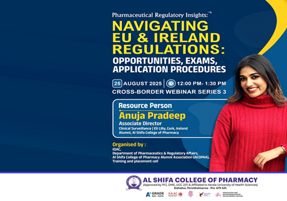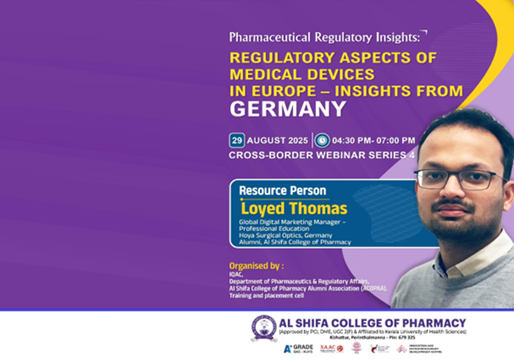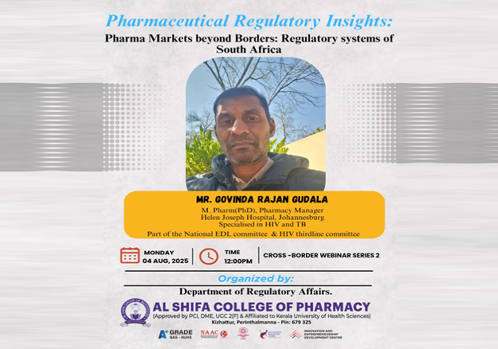 The Department of Pharmaceutics & Regulatory Affairs at Al Shifa College of Pharmacy successfully conducted the second session of its Cross-Border Webinar Series on August 4, 2025. The theme of the session was “Pharmaceutical Regulatory Insights: Pharma Markets beyond Borders – Regulatory Systems of South Africa”.